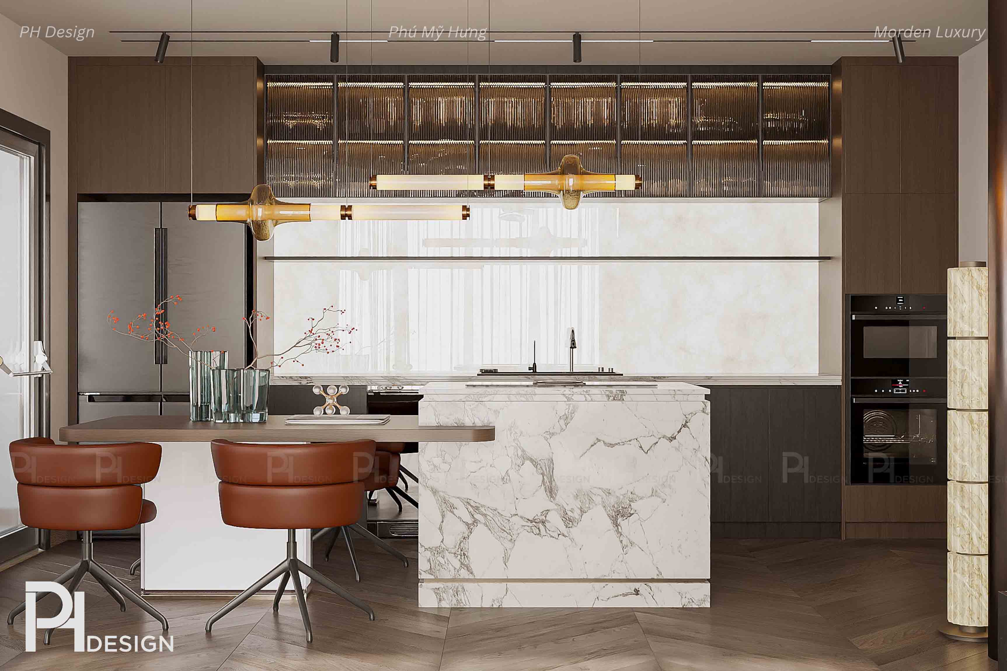 Không gian mở liền mạch giữa bếp và phòng khách tạo cảm giác rộng và thoáng, trong khi tông màu trung tính — be, trắng, nâu sậm — trở thành nền hoàn hảo để làm nổi bật điểm nhấn kim loại và gỗ veneer tự nhiên.