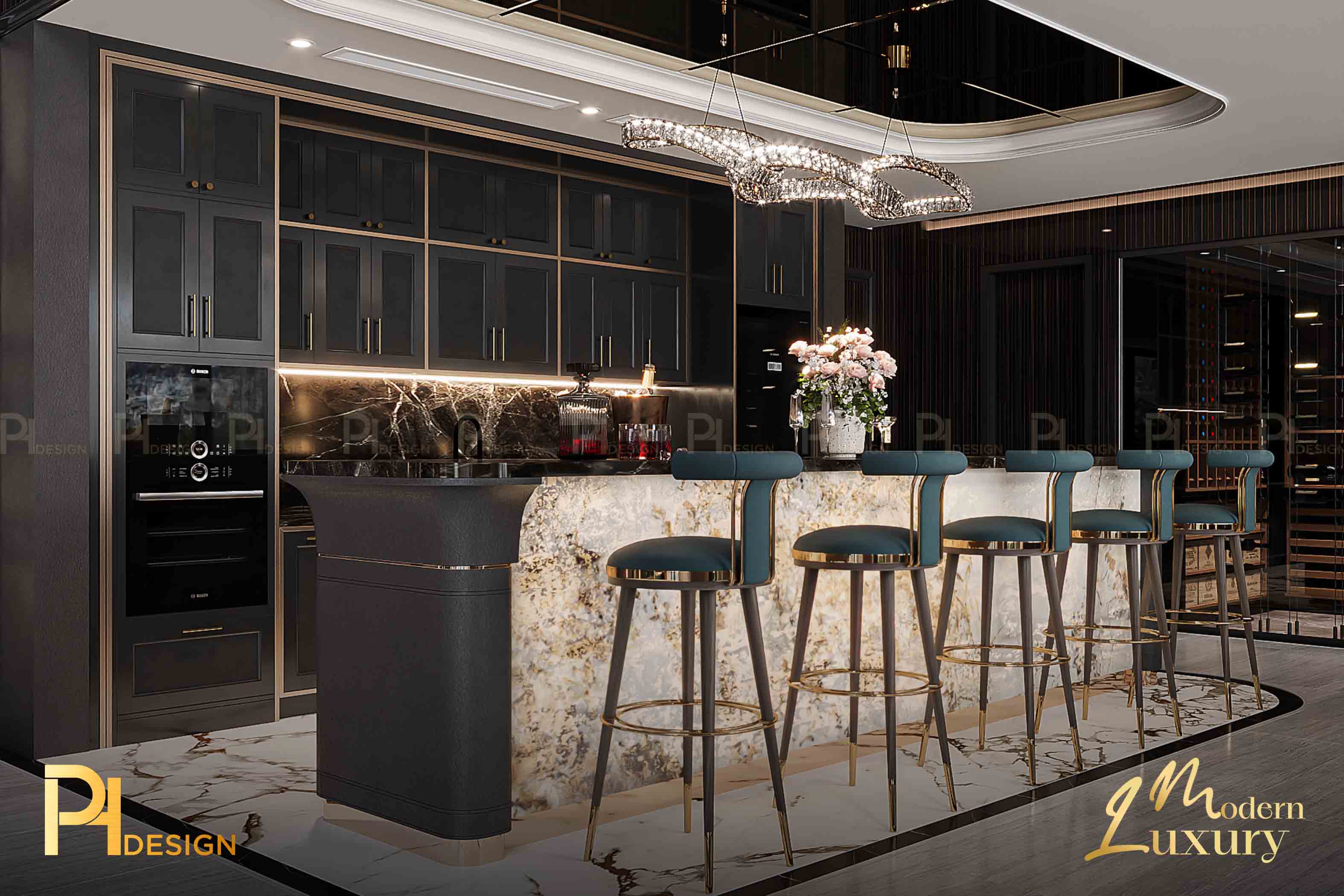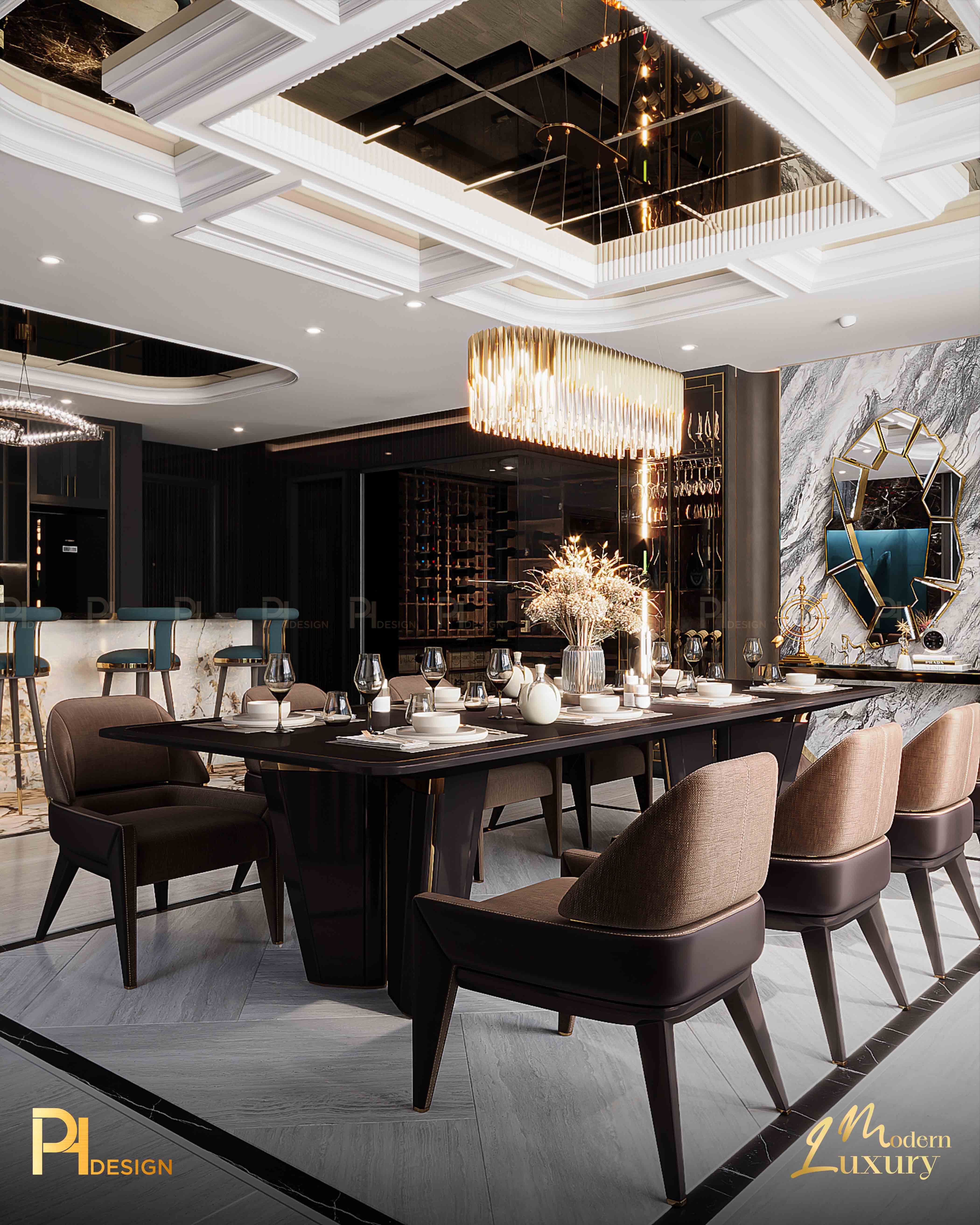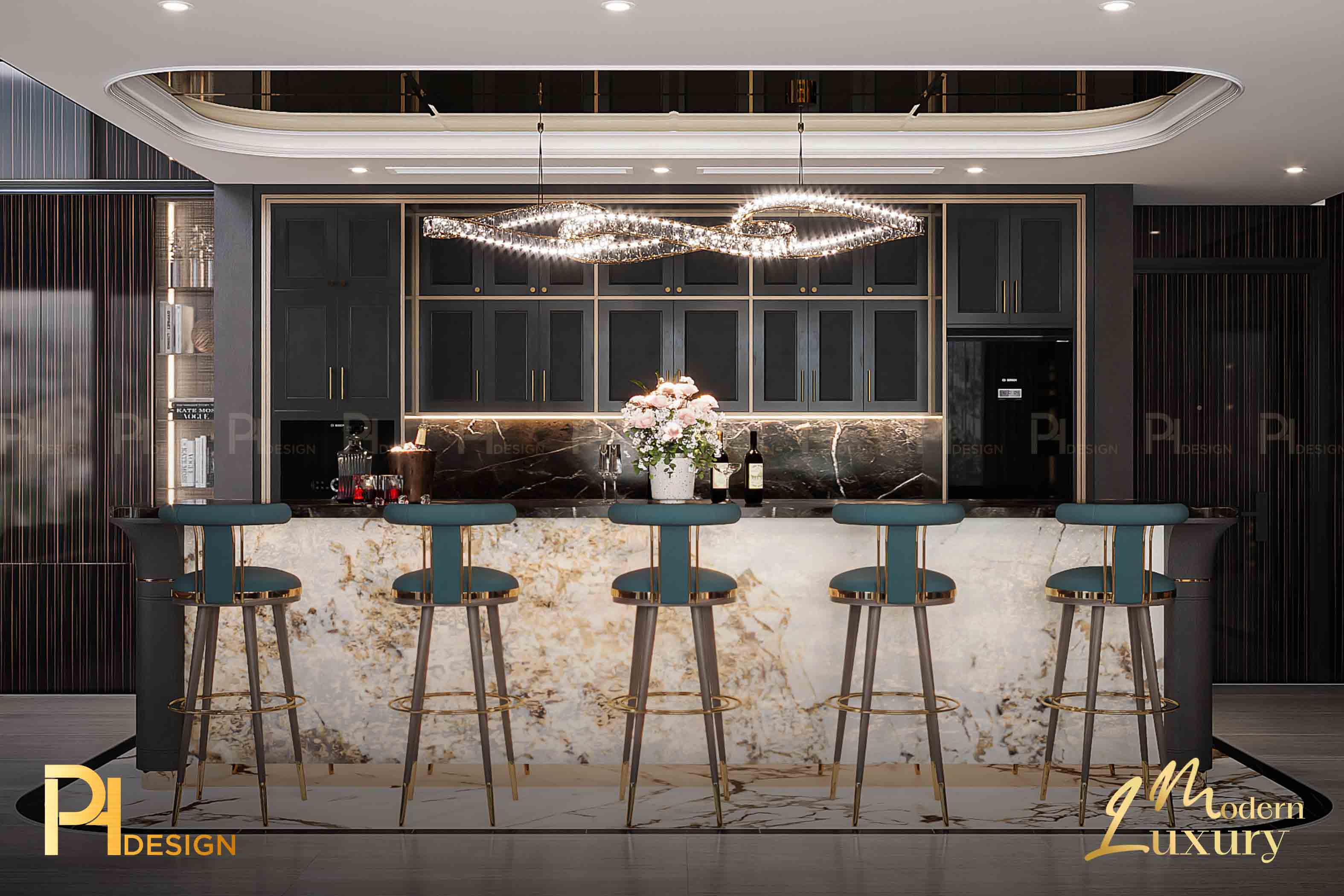 Trần nhà cao, đèn thả nghệ thuật như một bức tranh điêu khắc giữa không trung. Nó nhắc ta rằng: kiến trúc không chỉ là dựng nên bốn bức tường, mà còn là cách thổi cảm xúc vào khoảng trống. Ánh sáng nơi đây không chỉ để soi tỏ, mà để dẫn lối. Từ những mảng tường, vân gỗ đến từng gam màu trầm – tất cả cùng nhau tạo nên một khúc nhạc thị giác. Art Deco mang đến sự sang trọng, phô diễn sự tinh xảo.