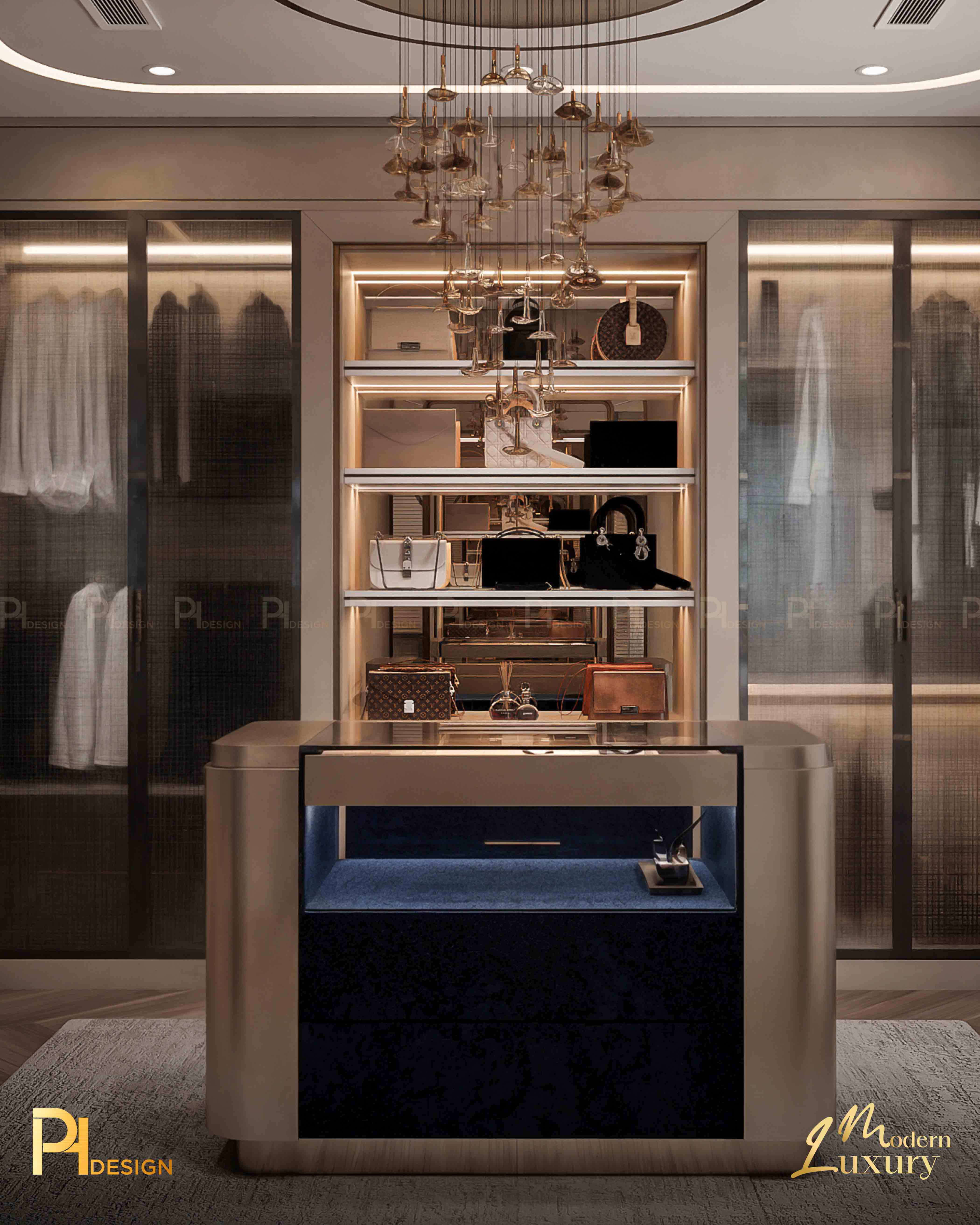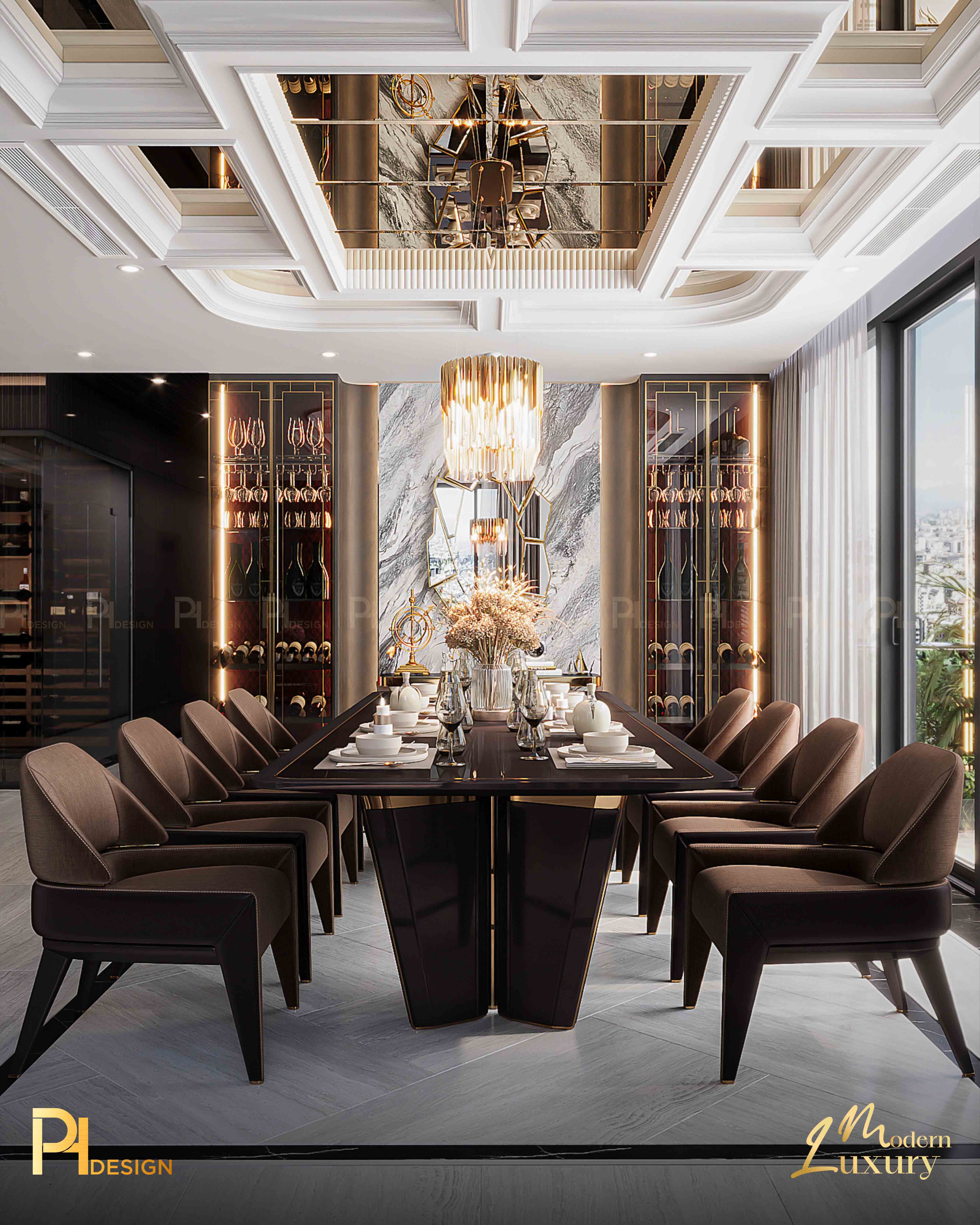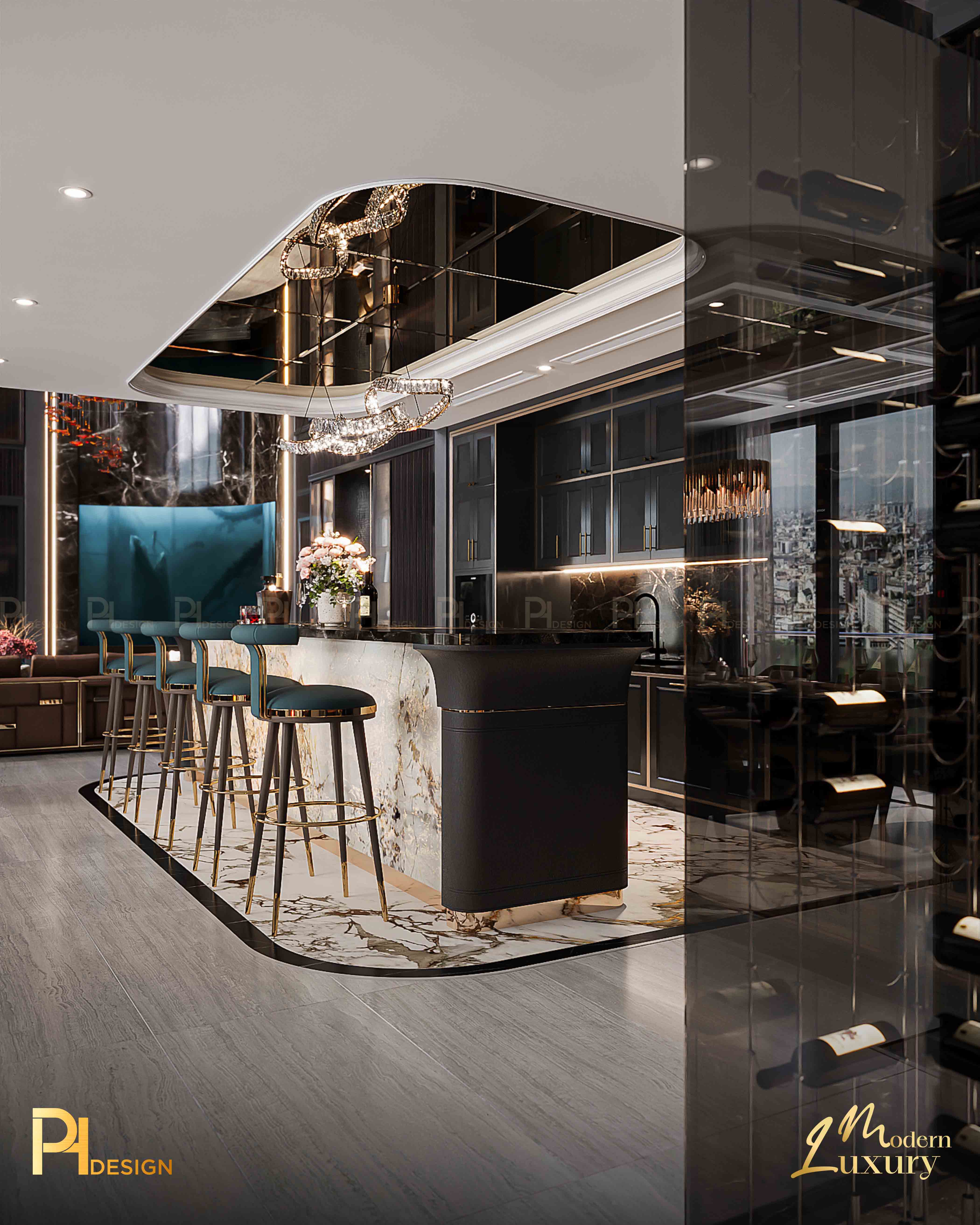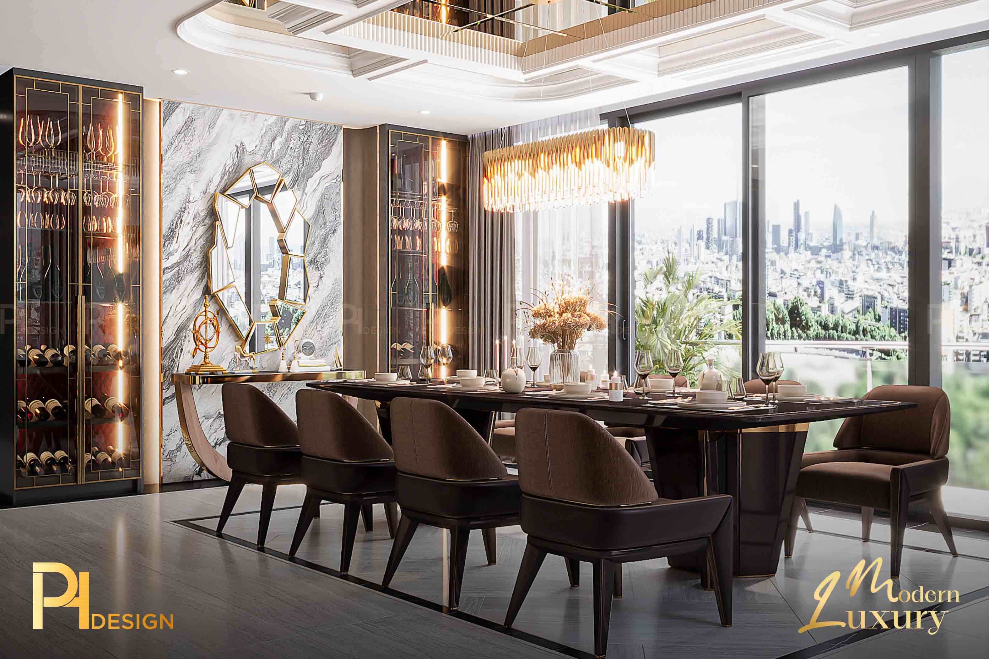 Trần nhà cao, đèn thả nghệ thuật như một bức tranh điêu khắc giữa không trung. Nó nhắc ta rằng: kiến trúc không chỉ là dựng nên bốn bức tường, mà còn là cách thổi cảm xúc vào khoảng trống. Ánh sáng nơi đây không chỉ để soi tỏ, mà để dẫn lối. Từ những mảng tường, vân gỗ đến từng gam màu trầm – tất cả cùng nhau tạo nên một khúc nhạc thị giác. Art Deco mang đến sự sang trọng, phô diễn sự tinh xảo.